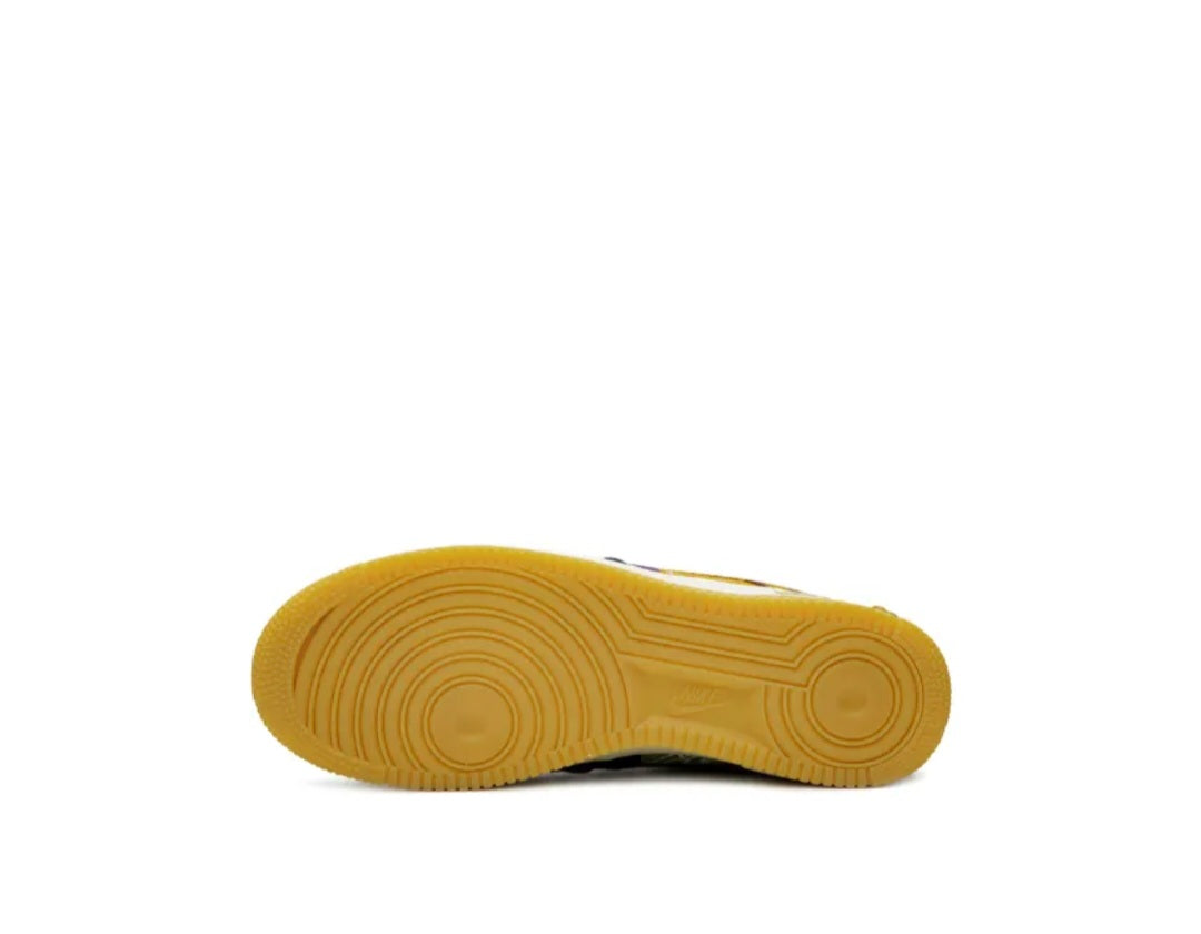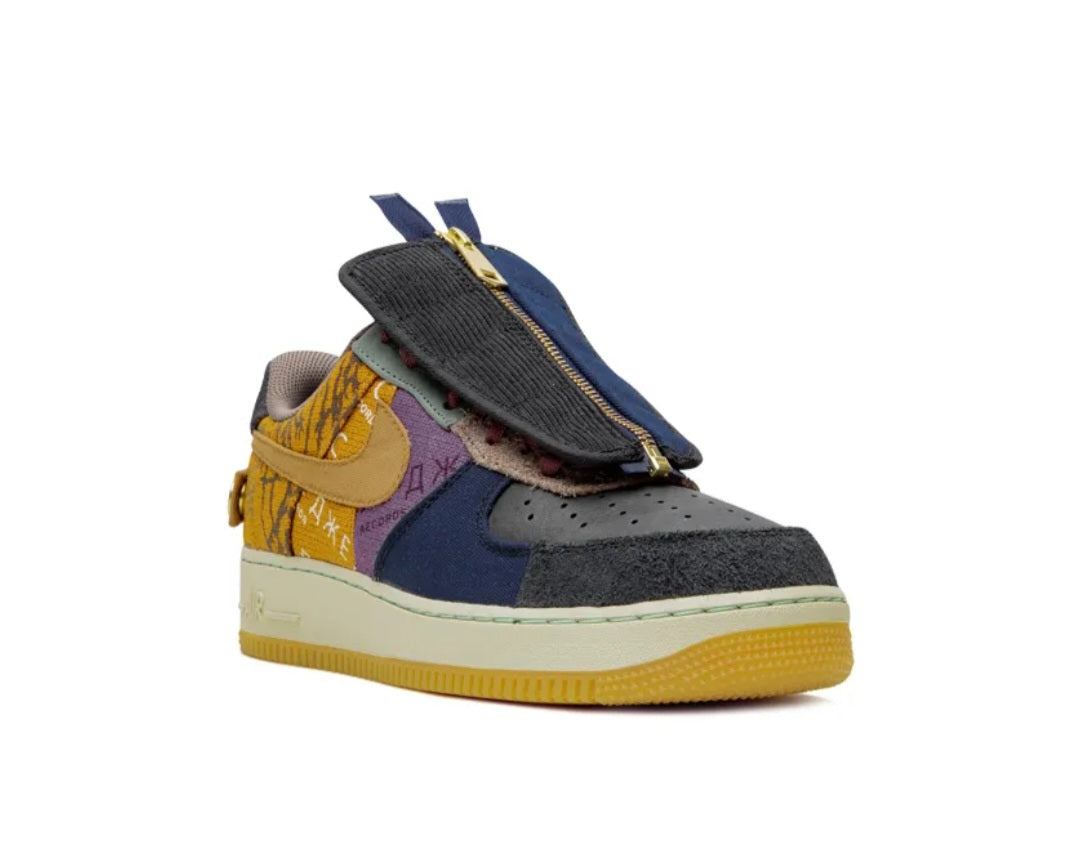Supplied by a premier sneaker marketplace dealing with unworn, already sold out, in demand rarities. Each product is rigorously inspected by experienced experts guaranteeing authenticity. The Travis Scott x Nike Air Force 1 Low “Cactus Jack” is Scott’s intentionally rough-and-tumble reimagining of the revered silhouette. The patchwork design calls to mind Nike’s Bespoke Design Lab formerly located in downtown Manhattan for its sewn-together, DIY-inspired ethos. Scott outfits his second Air Force 1 Low collaboration with sturdy canvas patches that include shades of brown, lilac, dark navy blue, and black along the upper. A brown canvas Swoosh is located on each lateral side with a camo Swoosh on each medial side. Scott's "Cactus Jack" graphics can be found printed across various panels of the upper. A black leather perforated toe contrasts the canvas, as does a unique black corduroy and blue nylon lace cover with a large gold zipper running down the middle. The medial side of the shoe